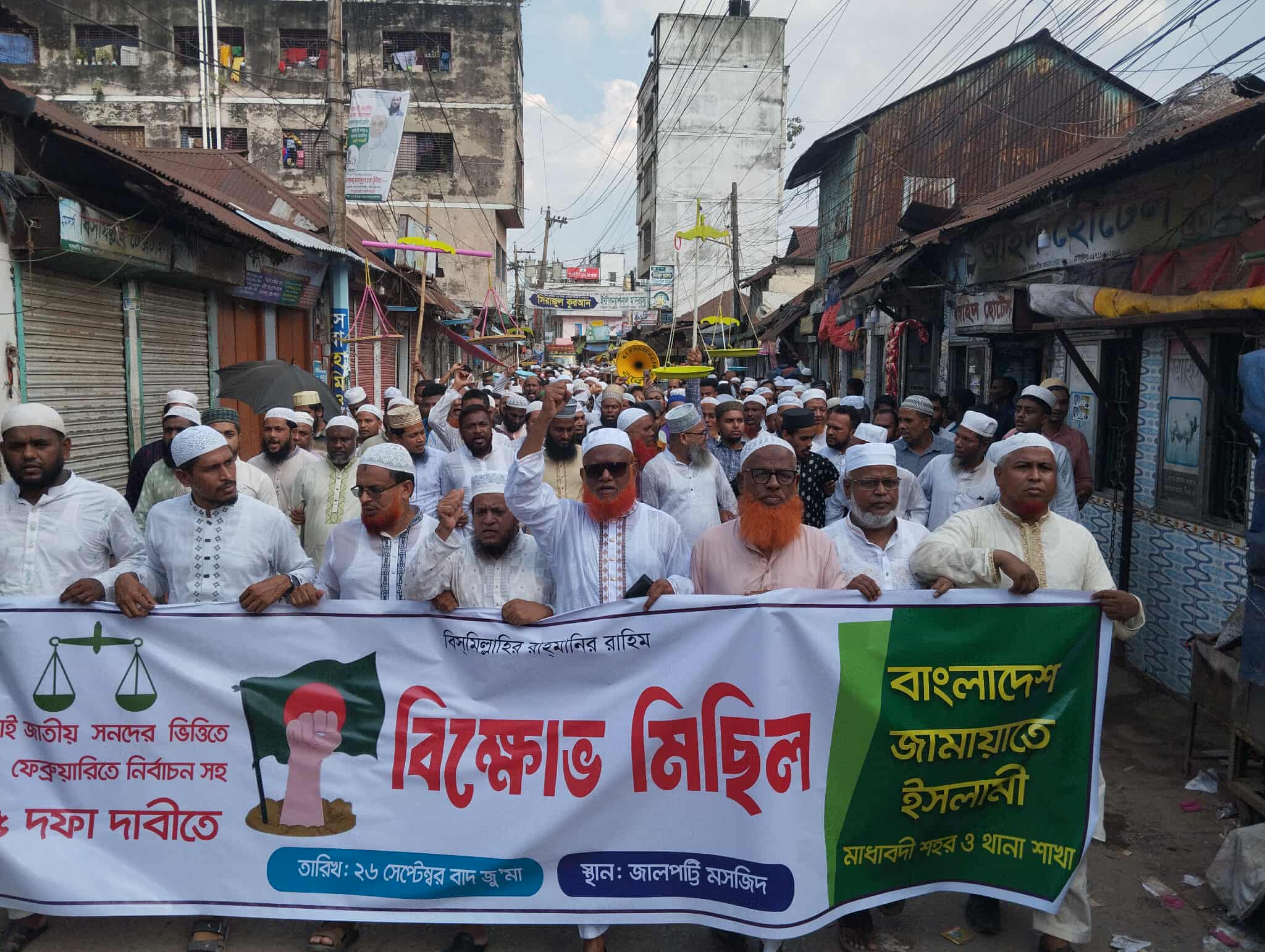 মুহাম্মদ মুছা মিয়া, মাধবদী (নরসিংদী) প্রতিনিধিঃ নরসিংদীর মাধবদীতে জাতীয় নির্বাচনে পি.আর ও সংস্কার সহ ৫ দাবীতে পৃথক পৃথকভাবে বিক্ষোভ মিছিল করেছে বাংলাদেশ জামাতে ইসলামী, ইসলামী আন্দোলন বাংলাদেশ ও বাংলাদেশ খেলাফত মজলিশ। আজ বাদ জুমআ মাধবদী বাজার জালপট্টি মসজিদ থেকে এই বিক্ষোভ মিছিল বের করে বাংলাদেশ জামায়াতে ইসলামী মাধবদী শহর শাখা ও মাধবদী থানা শাখা। অপরদিকে মাধবদী আনন্দী চৌরাস্তা আল আকসা মসজিদ থেকে ইসলামী আন্দোলন বাংলাদেশ ও মাধবদী বাজার বড় মসজিদ থেকে বাংলাদেশ খেলাফত মজলিস এই বিক্ষোভ মিছিল বের করেন। দলগুলোর কেন্দ্র ঘোষিত কর্মসূচী হিসেবে এই বিক্ষোভ মিছিল পালন করা হয়। বিক্ষোভ মিছিলে যে ৫টি দাবীর কথা বলা হয় তা হলো- (১) জুলাই জাতীয় সনদের ভিত্তিতে আগামী ফেকব্রুয়ারিতে নির্বাচন আয়োজন করা। (২) আগামী জাতীয় নির্ভাচনে সংসদের উভয় কক্ষে পিআর পদ্ধতি চাল করা। (৩) অবাধ, সুষ্ঠু ও গ্রহণযোগ্য নির্বাচনের লক্ষে সবার জন্য লেভেল প্লেয়িং ফিল্ড নিশ্চিত করা। (৪) ফ্যাসিস্ট সরকারের সব জুলুম-নির্যাতন, গণহত্যা ও দুর্নীতির বিচার দৃশ্যমান করা। (৫) স্বৈরাচারের দোসর জাতীয় পার্টি ও ১৪ দলের কার্যক্রম নিষিদ্ধ করা।