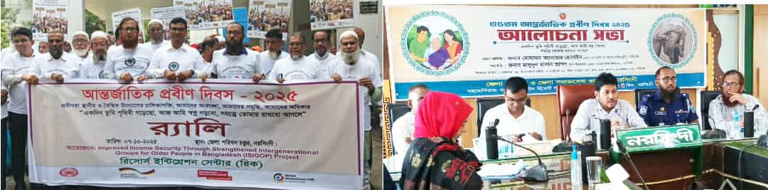 "একদিন তুমি পৃথিবী গড়েছো, আজ আমি স্বপ্ন গড়বো, সযত্নে তোমায় রাখবো আগলে"। এ প্রতিপাদ্যে নরসিংদীতে ৩৫ তম আন্তর্জাতিক প্রবীণ দিবস উপলক্ষে ৭ অক্টোবর মঙ্গলবার সকালে রিসোর্স ইন্টিগ্রেশন সেন্টার (রিক) এর সহযোগিতায় নরসিংদী জেলা প্রশাসক কার্যালয়ের সমূখে র্যালী ও জেলা প্রশাসক হলরুমে আলোচনা সভা অনুষ্ঠিত হয়েছে।