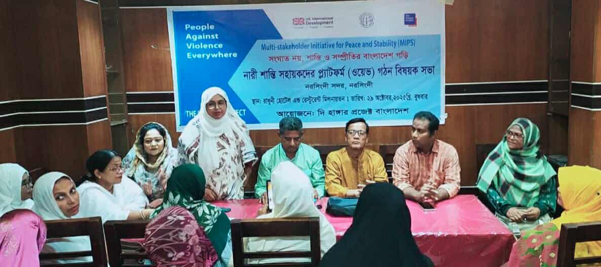 দি হাঙ্গার প্রজেক্ট বাংলাদেশ এর এমআইপিএস প্রকল্পের অনুপ্রেরণায় নরসিংদী সদর পিস ফ্যাসিলিটেটর গ্রুপের (পিএফজি) উদ্যোগে উইমেন অ্যাগেইনস্ট ভায়োলেন্স এভরিহয়্যার (ওয়েভ) প্ল্যাটফর্ম গঠন করা হয়েছে। আজ ২৯ অক্টোবর ২০২৫, রাধুনী রেস্টুরেন্ট মিলনায়তনে নারীর প্রতি সকল প্রকার সহিংসতা রোধে উপজেলার শান্তি-সম্প্রীতি রক্ষায় বিভিন্ন স্তরের ২২ জন নারী সদস্যদের নিয়ে এই প্ল্যাটফর্ম গঠন বিষয়ক সভা অনুষ্ঠিত হয়। এতে সভাপ্রধানের দায়িত্ব পালন করেন নরসিংদী সদর পিএফজি'র পিস অ্যাম্বাসেডর অ্যাডভোকেট রাজিয়া সুলতানা জুপি। ওয়াইপিএজি’র কো-কোঅর্ডিনেটর উম্মে হানির সঞ্চালনায় সভায় বক্তব্য রাখেন দি হাঙ্গার প্রজেক্ট বাংলাদেশের ফিল্ড কোঅর্ডিনেটর রিপন আচার্য, পিস অ্যাম্বাসেডর এম মোজাম্মেল হক, পিএফজি কোঅর্ডিনেটর হলধর দাস, ফিরোজা বেগম, সবিতা রায়, নার্গিস আক্তার প্রমুখ।