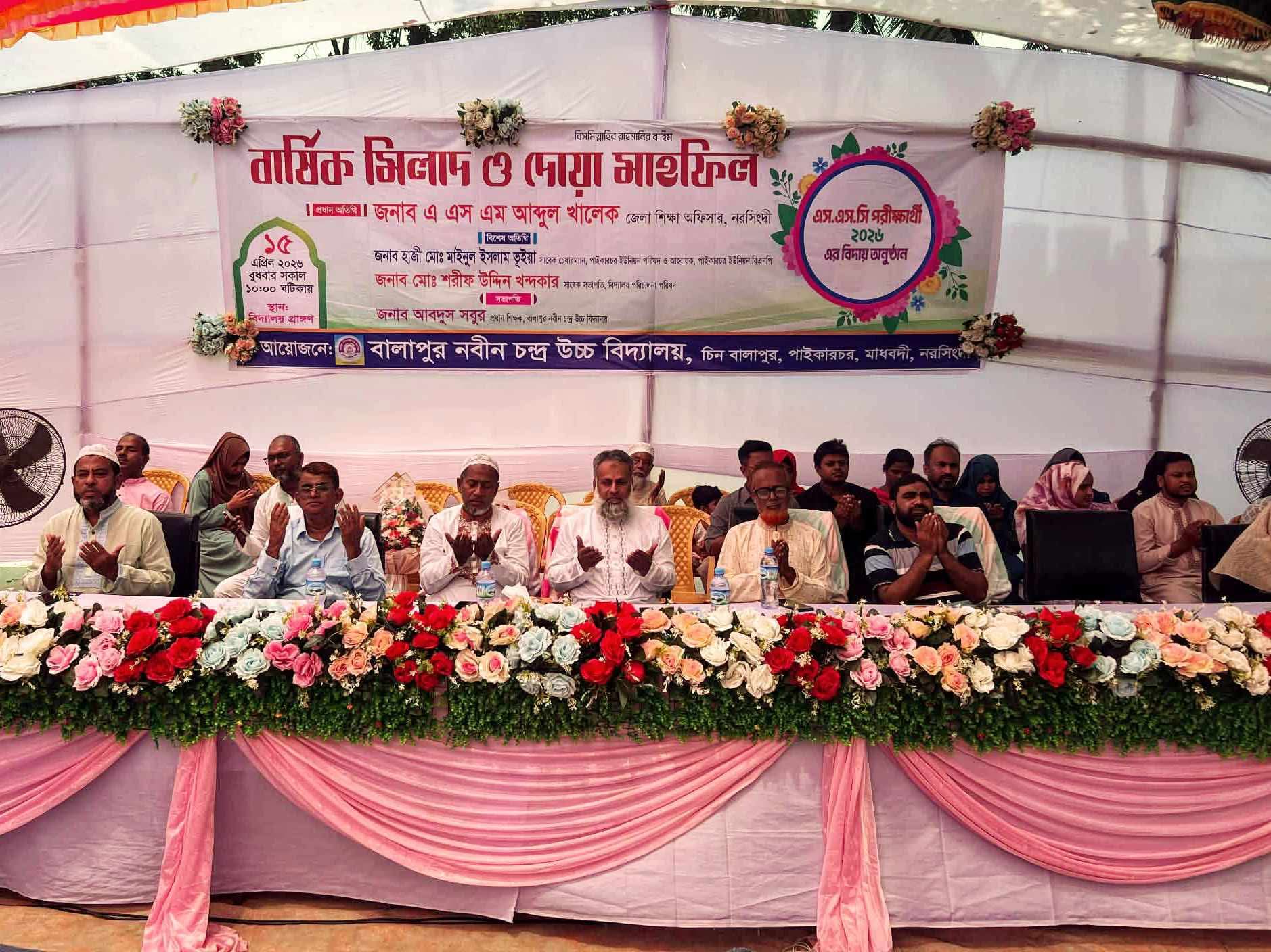 নরসিংদী সদর উপজেলার মাধবদীর থানার পাইকারচর ইউনিয়নের ঐতিহ্যবাহী বালাপুর নবীন চন্দ্র উচ্চ বিদ্যালয়ে ২০২৬ সালের এসএসসি পরীক্ষার্থীদের বিদায় সংবর্ধনা, বার্ষিক মিলাদ ও দোয়া মাহফিল অনুষ্ঠিত হয়েছে।